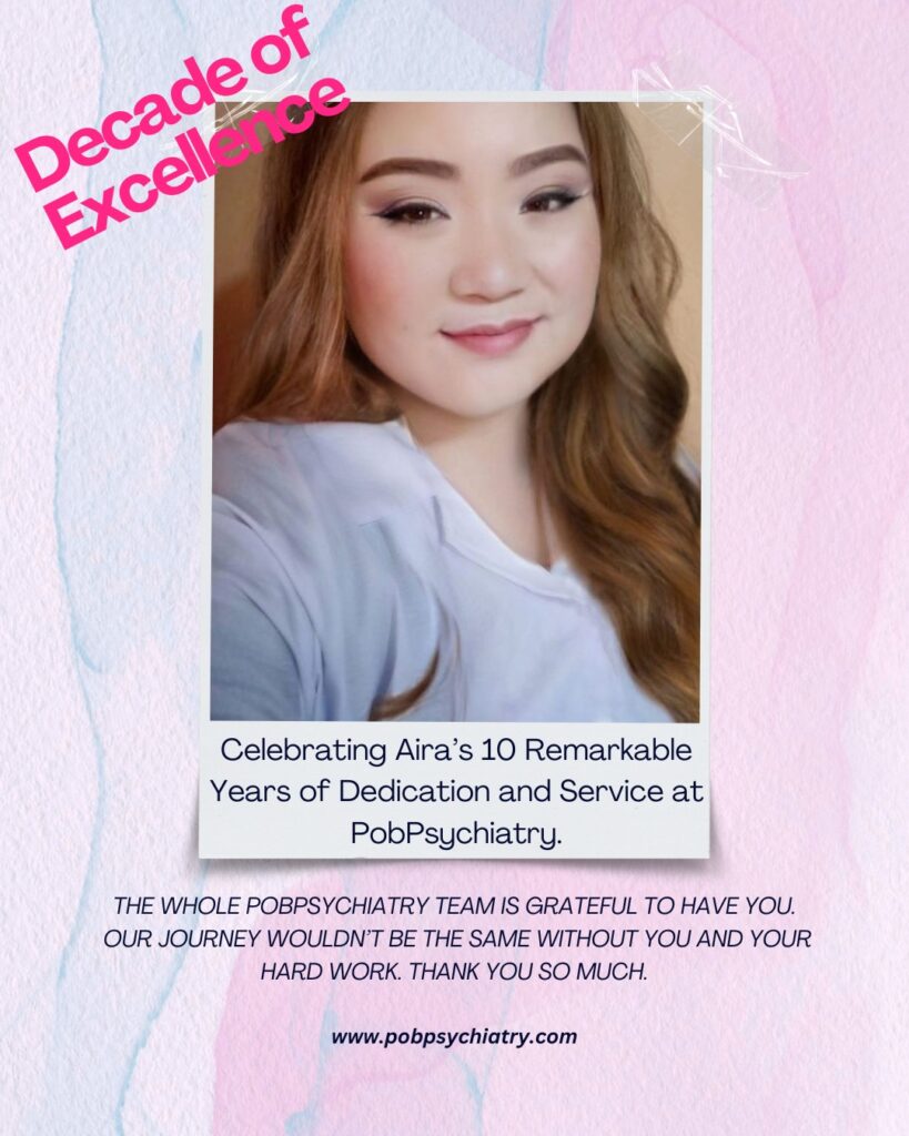 Today, we proudly celebrate Aira‘s 10th year at PobPsychiatry—a decade marked by compassion, dedication, and unwavering commitment to mental health care. From day one, Aira has been an integral part of our team, offering not just professional excellence but also a kind heart and steady presence that uplifts both colleagues and patients alike. Her contributions have shaped our growth and culture in countless ways. We are incredibly grateful for her service and look forward to many more years of shared success and meaningful impact. Congratulations, Aira, on this inspiring milestone!
